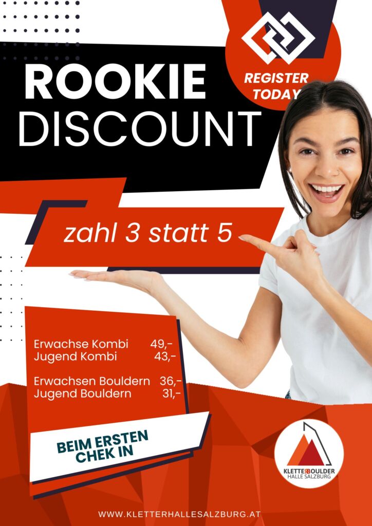Komm vorbei, registriere dich und starte dein Kletterabenteuer mit dem Rookie Discount.